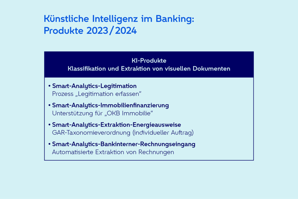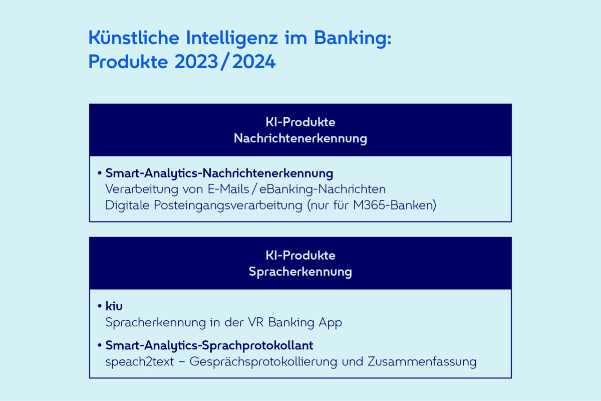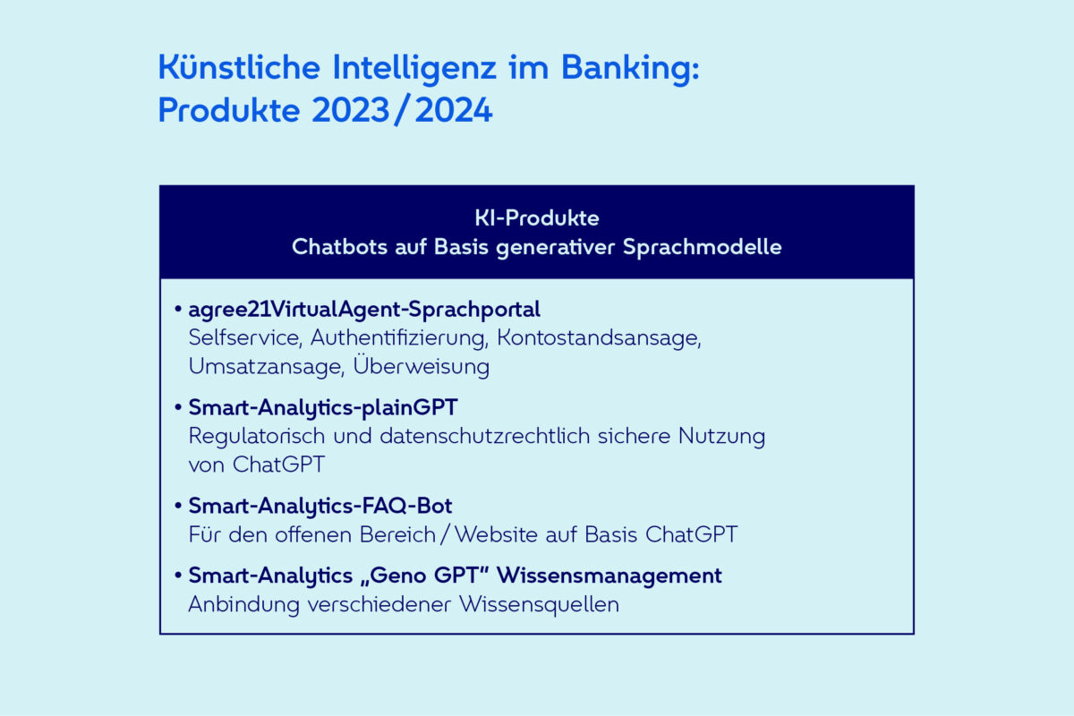 Durch die Automatisierung von routinemäßigen Aufgaben, effektives Wissensmanagement und die Unterstützung mittels intelligenter Chatbots bieten die KI-Produkte von Atruvia ein großes Potenzial für die Entlastung der Banken. Beispielsweise konnten 2023 mittels KI wesentliche Prozessoptimierungen für Legitimationen sowie im Immobiliengeschäft erreicht werden. Atruvia setzt auf maßgeschneiderte KI-Produkte im Bankensektor und legt dabei besonderes Augenmerk auf die Einhaltung regulatorischer Anforderungen. Die Grafik zeigt die verfügbaren und geplanten KI-Produkte.